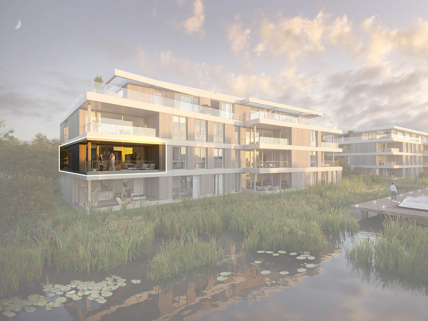 De 3 en 4-kamerappartementen Type Meerzicht liggen op de eerste en tweede verdieping. Want zeg nou zelf, met ca 119 - 127 m2 aan woonplezier en losse inpandige berging heb je toch ruimte genoeg? Door de ligging in deze prachtige groene omgeving in de buurt van water kom je helemaal tot rust. Klaar om te verhuizen? Op pad met jouw sloep? Geen probleem want die ligt voor je deur op jouw eigen ligplaats.