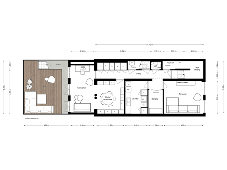 Het souterrain is volwaardig en licht, met een gastenkamer aan de voorzijde, een ruime berging (desgewenst geschikt voor een extra badkamer), een praktische laundry en een rustige werkruimte grenzend aan de zonnige binnentuin.
