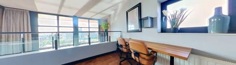 Fraaie open werkruimte met weids uitzicht, een spectaculaire vide die rondom voorzien is van een stoere balustrade, waardoor de New York Loft stijl extra geaccentueerd wordt en toegang tot de riante berging met aansluiting wasmachine en droger.