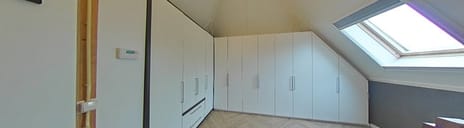 2e verdieping: De open zolderruimte beschikt over veel bergruimte en mogelijkheden voor het realiseren van een extra slaap- en/of werkkamer. Zowel de installaties als de aansluitingen voor de wasmachine en droger zijn praktisch geplaatst aan één zijde van de verdieping.