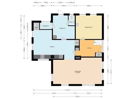 Behind the front door, we find the entrance hall with the meter cupboard, the staircase to the first floor, and access to both a bedroom and the living room with open kitchen.