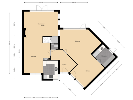 Vanuit de woonkamer doorgang naar de lichte en ruime zijkamer van ca. 45 m2 wat multifunctioneel te gebruiken is. De bijkeuken biedt extra bergruimte, plek voor wasmachine en droger en een extra deur naar de achtertuin.
