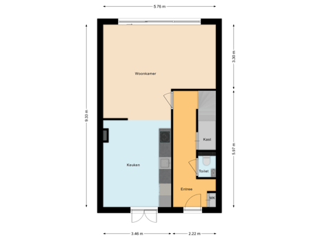 - 28 m² (4,80 meter diep en 5,80 meter breed)