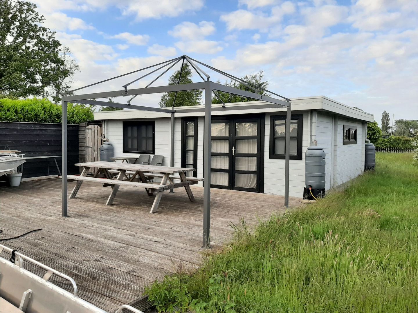 De blokhut is volledig ingericht. Alle aanwezige meubels en apparatuur zijn bij de vraagprijs inbegrepen. Denk hierbij aan bankstel (slaapbank), televisie, bedden, PAX kledingkast, eettafel met 4 stoelen, koelkast, vriezer, gaskookplaat, airfryer, combi-magnetron. Ook het buitenmeubilair zoals een picknicktafel en eettafelset, inclusief parasol en partytent blijven achter. De blokhut is 3 jaar oud, staat op palen, en heeft wel weer een likje verf nodig.