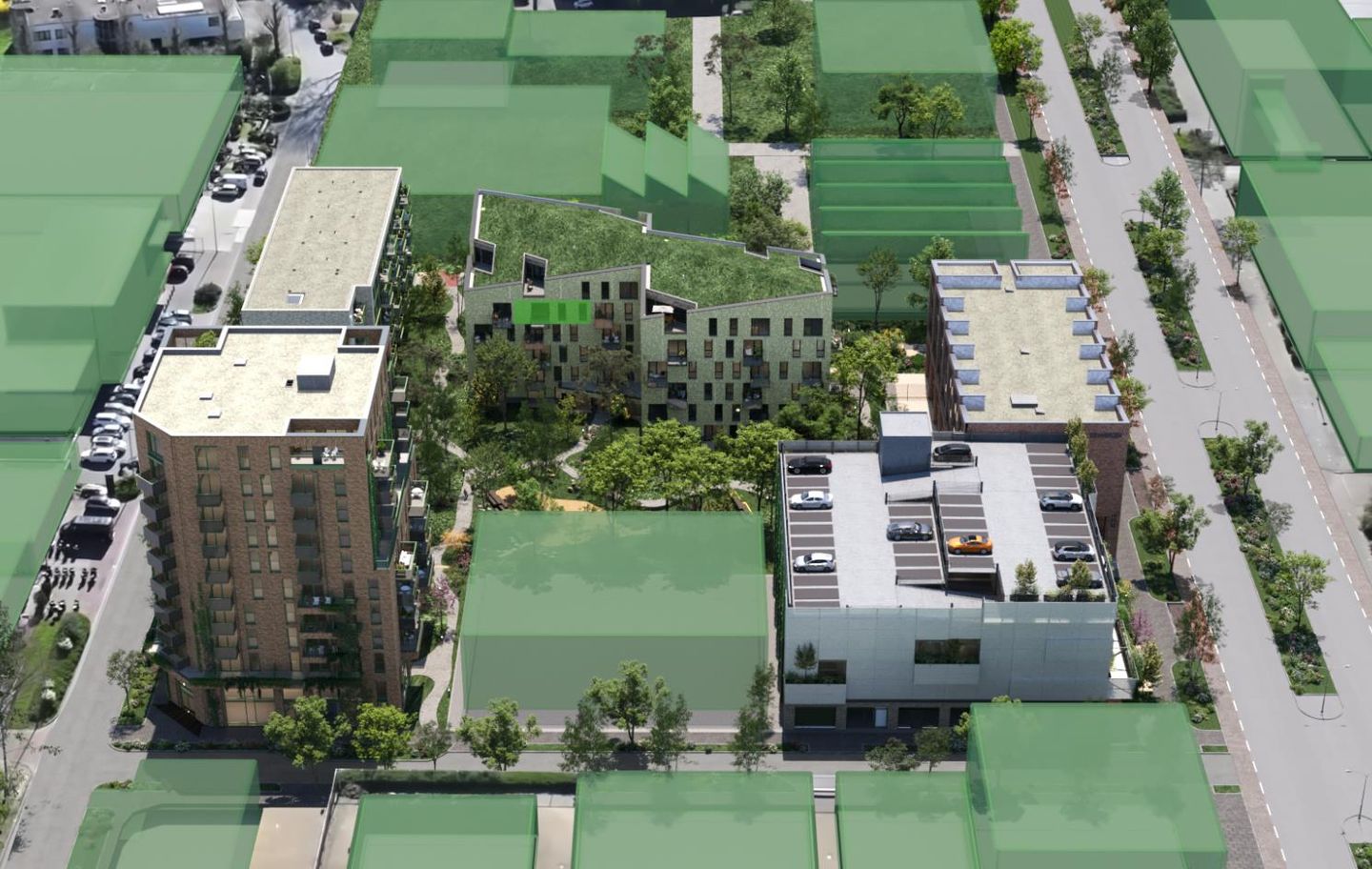 In het zesde blok, op de hoek, is de parking gelegen. De inrit van de parking ligt aan de Louis Pasteurstraat. Er zijn in totaal 177 parkeerplaatsen beschikbaar voor bewoners, bezoekers en werkruimten. De parking is afgesloten en alleen toegankelijk via een beveiligd parkeersysteem, zodat jouw auto veilig en droog staat. In de parking is het mogelijk een eigen parkeerplaats te kopen.