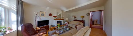 Upon entering, you are welcomed into a bright hallway that leads into the spacious living room. Thanks to the large front-facing windows, the room is beautifully lit and offers views over the charming residential surroundings. The living area provides ample space for a cozy sitting and dining area.