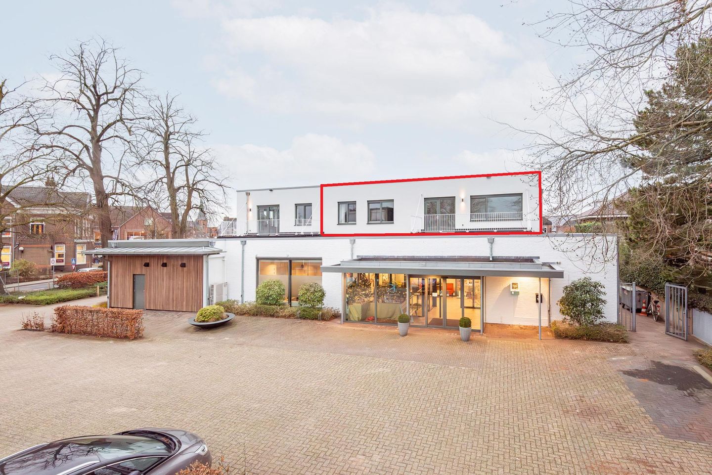 De buitenzijde is gestukt en met moderne houtaccenten afgewerkt, wat het geheel een frisse en eigentijdse uitstraling geeft. Op de begane grond bevinden zich kantoor- en praktijkruimten en op de verdieping zijn drie prachtige appartementen gerealiseerd, waaronder het appartement Terborgseweg 2B. Het is het ruimste appartement, ligt aan de achter-/zijkant van het gebouw en kijkt uit op de Polstraat.