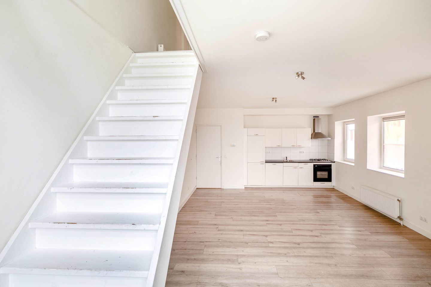 Lichte woonkamer met open keuken en inbouwapparatuur.