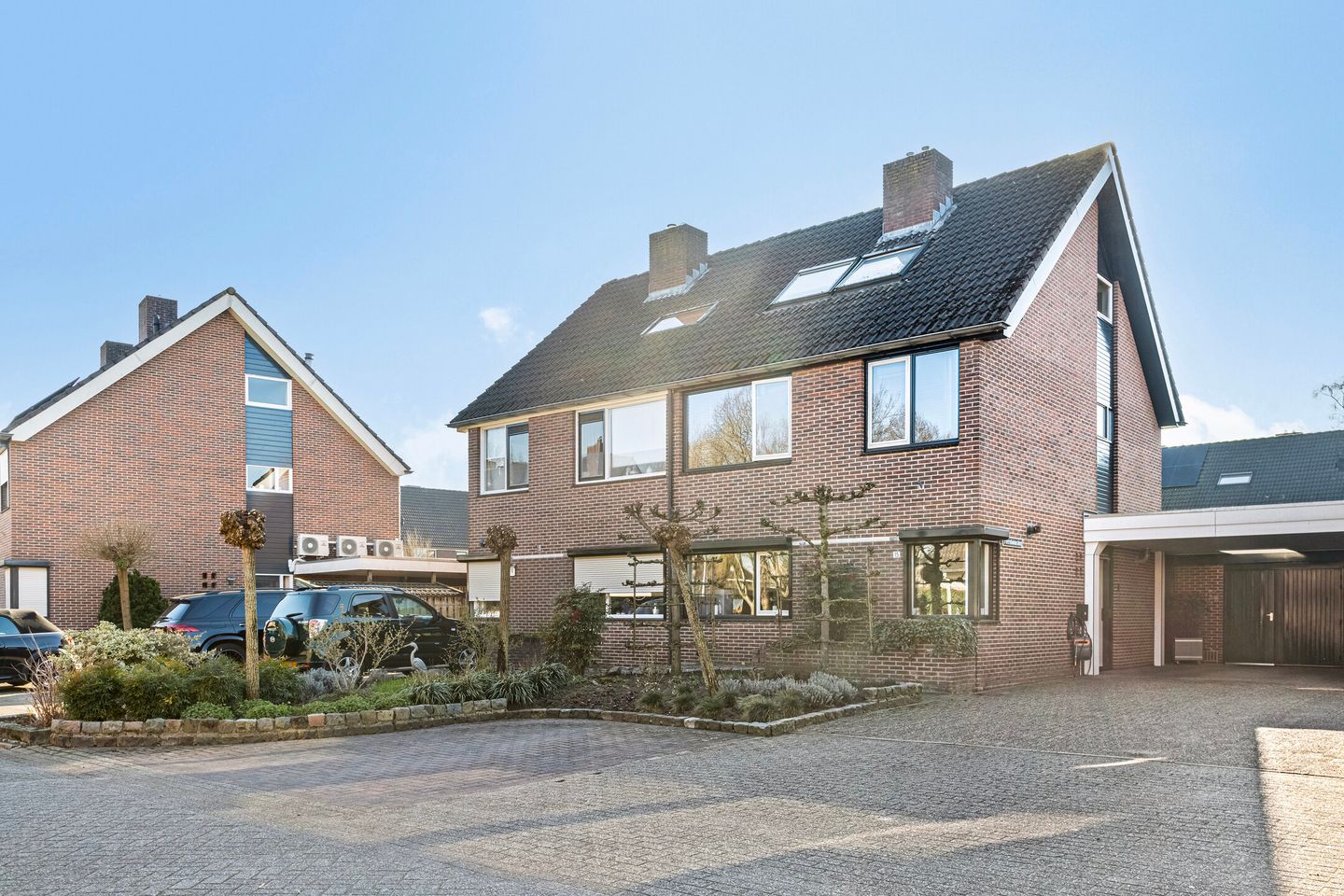 De royale oprit biedt plaats voor meerdere voertuigen (4) en beschikt over een overdekte parkeerplek onder een ruime carport, inclusief oplaadpunt voor een elektrische auto.