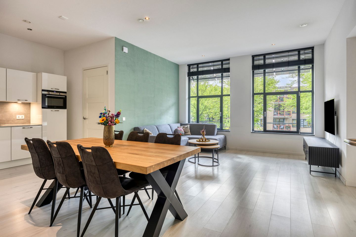 Bij binnenkomst stap je een verzorgde hal binnen. De ruime woonkamer is strak afgewerkt en voorzien van grote raampartijen aan de zonzijde, waardoor het appartement de hele dag door geniet van een fijne lichtinval. De vloer is voorzien van laminaat. De moderne open keuken is in een hoek opgesteld en uitgerust met alle benodigde inbouwapparatuur zoals een inductie kookplaat, koelkast, vaatwasser en een combi-oven. Ter hoogte van de keuken is voldoende ruimte voor een fijne eethoek.