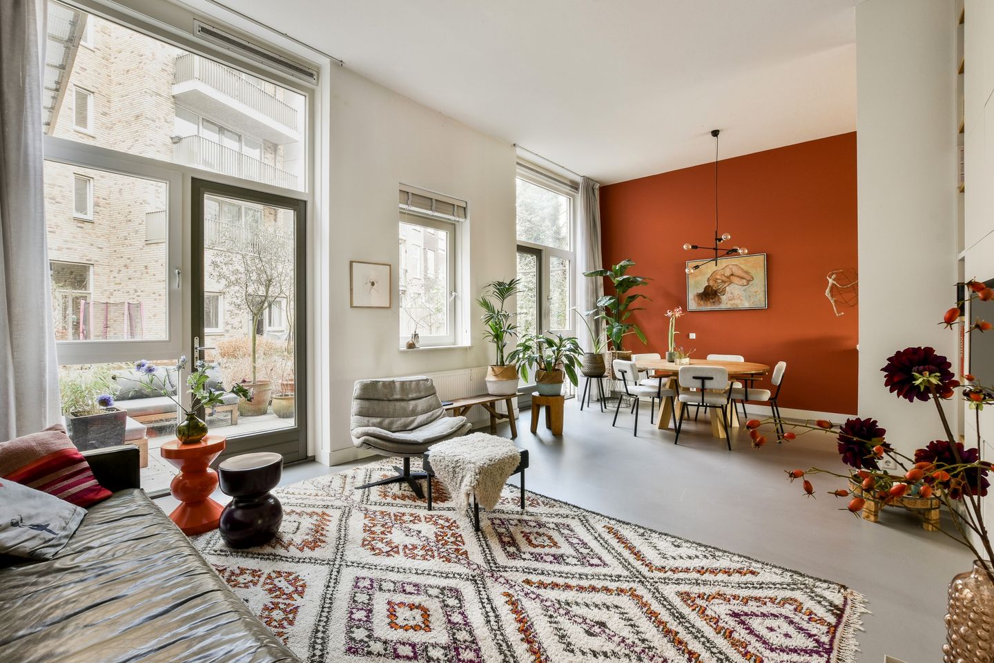 Deze ruime benedenwoning beschikt over een terras van maar liefst circa 15 m2. Gelegen aan een ruime gemeenschappelijke binnentuin. ideaal om te ontspannen en te genieten van de frisse lucht. Met een plafondhoogte van 3.55 m voelt de woning extra ruimtelijk en luxueus aan. De vloer is afgewerkt met hoogwaardig Marmoleum, wat zorgt voor een moderne uitstraling. De fraaie keuken met betonblad en fronten van massief eikenhout, 90 cm breed 5-pits smeg gasfornuis met oven en cooker waterkraan, voegt een vleugje elegantie toe aan de woning.