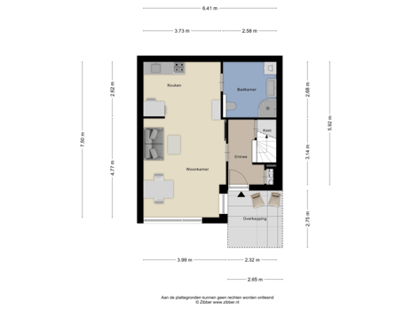 Overkapping bij de voordeur, entree/hal met garderobekast en deels aangepaste vernieuwde meterkast. Vanuit de entree kom je in een heerlijke open woon-/werkruimte met eenvoudige keukenopstelling. De open woonruimte is ook fantastisch te gebruiken als Master-bedroom. Er is een grote badkamer met douche, toilet, wastafel en een wasmachine-aansluiting.