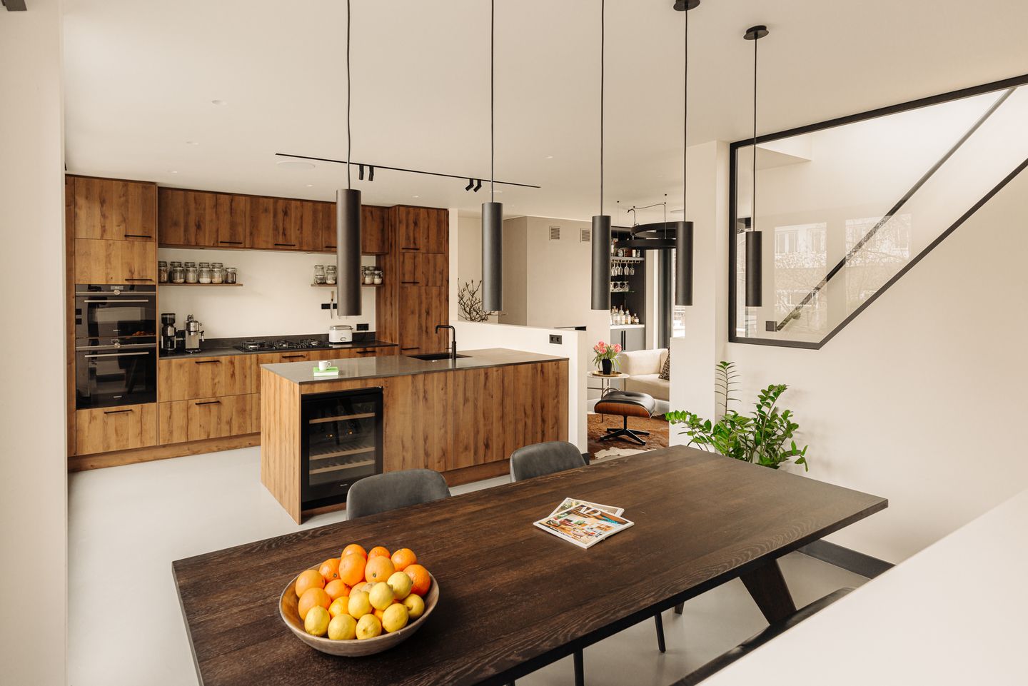 The third and top floor of the apartment is the heart of the home. The loft-like living space is characterized by stunning light coming through the large sliding doors, giving the apartment an open, airy feel. The living room features a cozy fireplace and is surrounded by a peaceful library area, perfect for relaxation. The kitchen is of the highest standard and equipped with top-of-the-line Miele appliances, ideal for passionate home chefs. The dining area, located at the front, has a glass sliding door that can be fully opened, creating a true indoor-outdoor feeling.