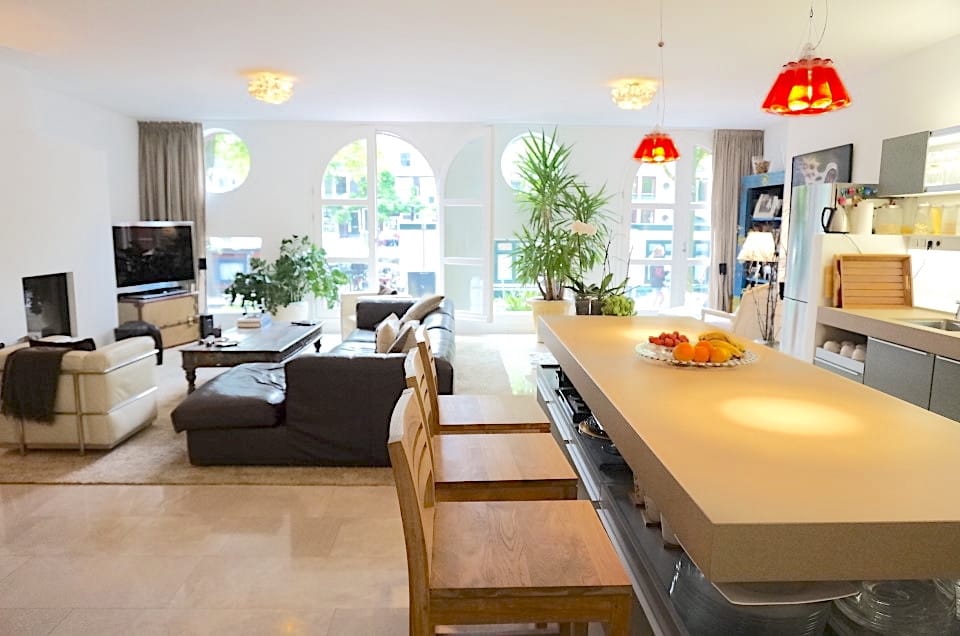 The loft-like living room, approximately 80 square meters with fireplace, is extremely light as the front of the building is facing south. The numerous windows and French balconies supply an unparalleled view of the beautiful canal and surroundings from different perspectives.