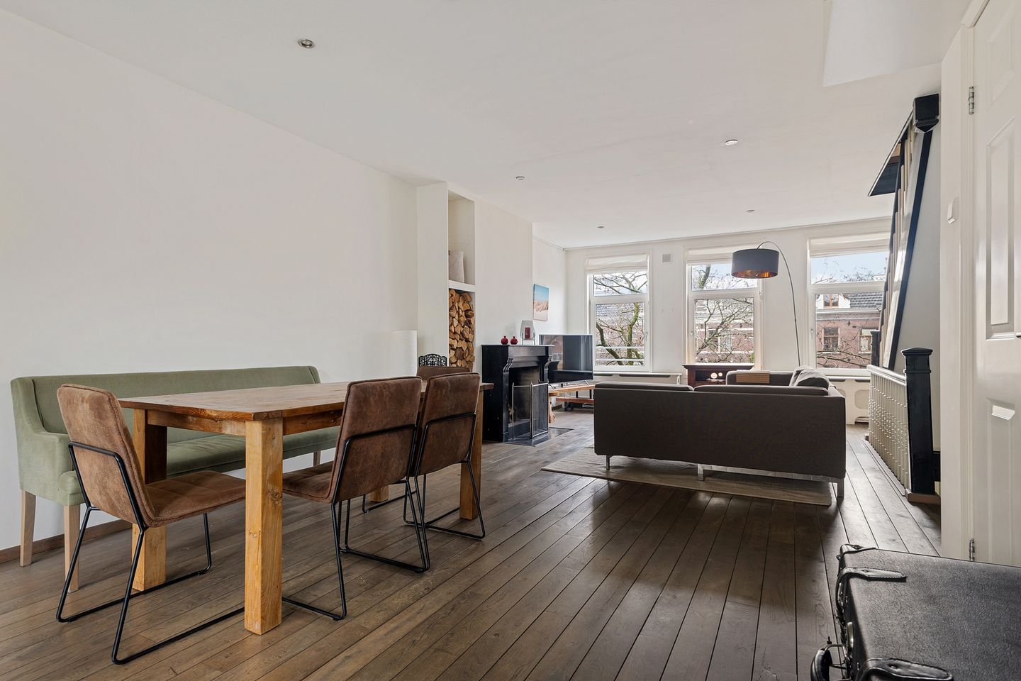Royale doorzonwoonkamer aan de voorzijde, drie ramen breed en daardoor heerlijk licht. De open haard met prachtige schouw en op maat gemaakte vaste kast voor houtopslag zorgt voor extra sfeer.