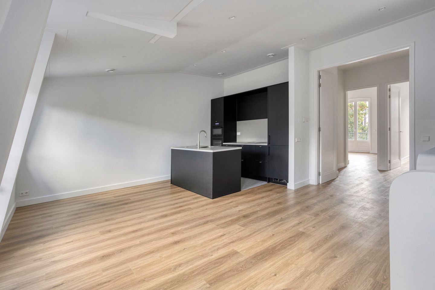 The bright living room at the front is wonderfully spacious and features an open-plan kitchen with an island and high-end built-in appliances. Such as an induction cooktop with integrated extractor, wine climate cabinet, dishwasher, fridge-freezer combination, and a Quooker.