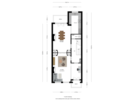 Hall with access to all rooms and toilet with fountain. Spacious living-/dining room with large windows which let a lot of natural light in. Semi-open kitchen at the rear equipped with various (built-in) appliances, including: 6-burner stove, refrigerator, freezer, extractor, oven, built-in coffee machine, built-in combi oven-microwave and dishwasher. From the rear through French doors access to the first balcony located on the south.
