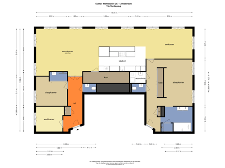 Door het gehele appartement ligt een fraaie houten Hongaarse punt parketvloer met vloerverwarming en koeling. De woning heeft een vrije hoogte van 3 meter.