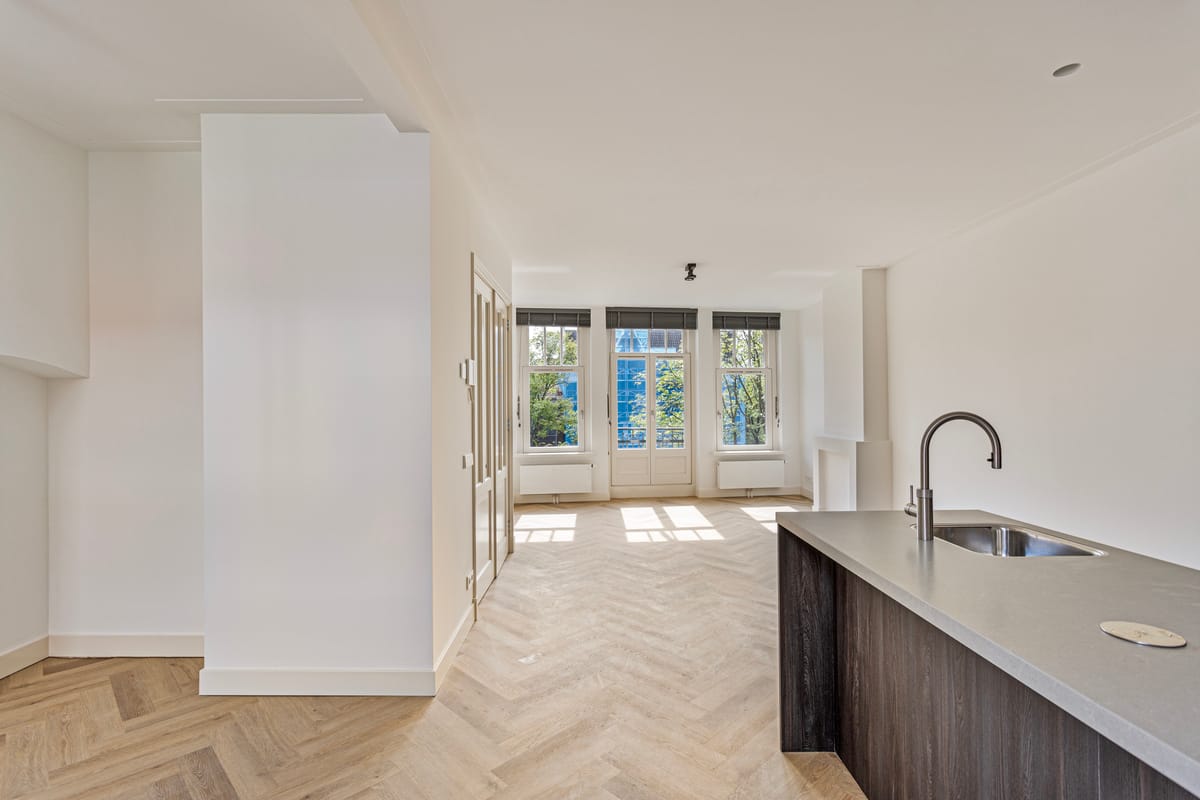 This beautiful apartment is located on the third and fourth floor of the building and was completely renovated in 2024. On the ground floor is the spacious, bright living room with open kitchen. The luxurious kitchen has a cooking island, sink with Quooker and induction hob, fridge-freezer, wine cooler, combination oven and dishwasher. Off the kitchen there is also a spacious utility room with wall cupboard and washing machine and dryer. At the front of the living room is a French balcony with a beautiful view over the canal. On the top floor there are two spacious bedrooms (16 m2 & 14.2 m2) and one smaller bedroom (6.8 m2). You will also find the modern bathroom at this floor, equipped with a bath with hand shower, a walk-in rain shower, double sink with furniture and towel radiator. The entire apartment is upholsterd with a high-quality PVC herringbone floor, window coverings and lighting.