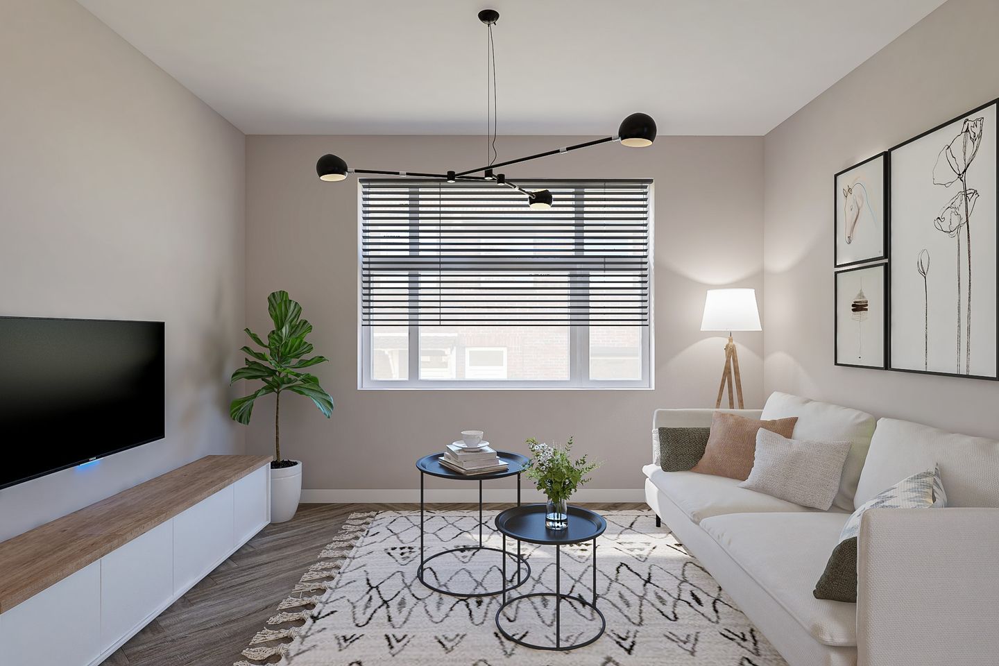 NB! THE APARTMENT IS NOT FURNISHED ONLY UPHOLSTERD. The entire apartment is delivered with a PVC floor. The windows in the living room will be fitted with dark wooden blinds and the bedrooms will be fitted with dark gray curtains.