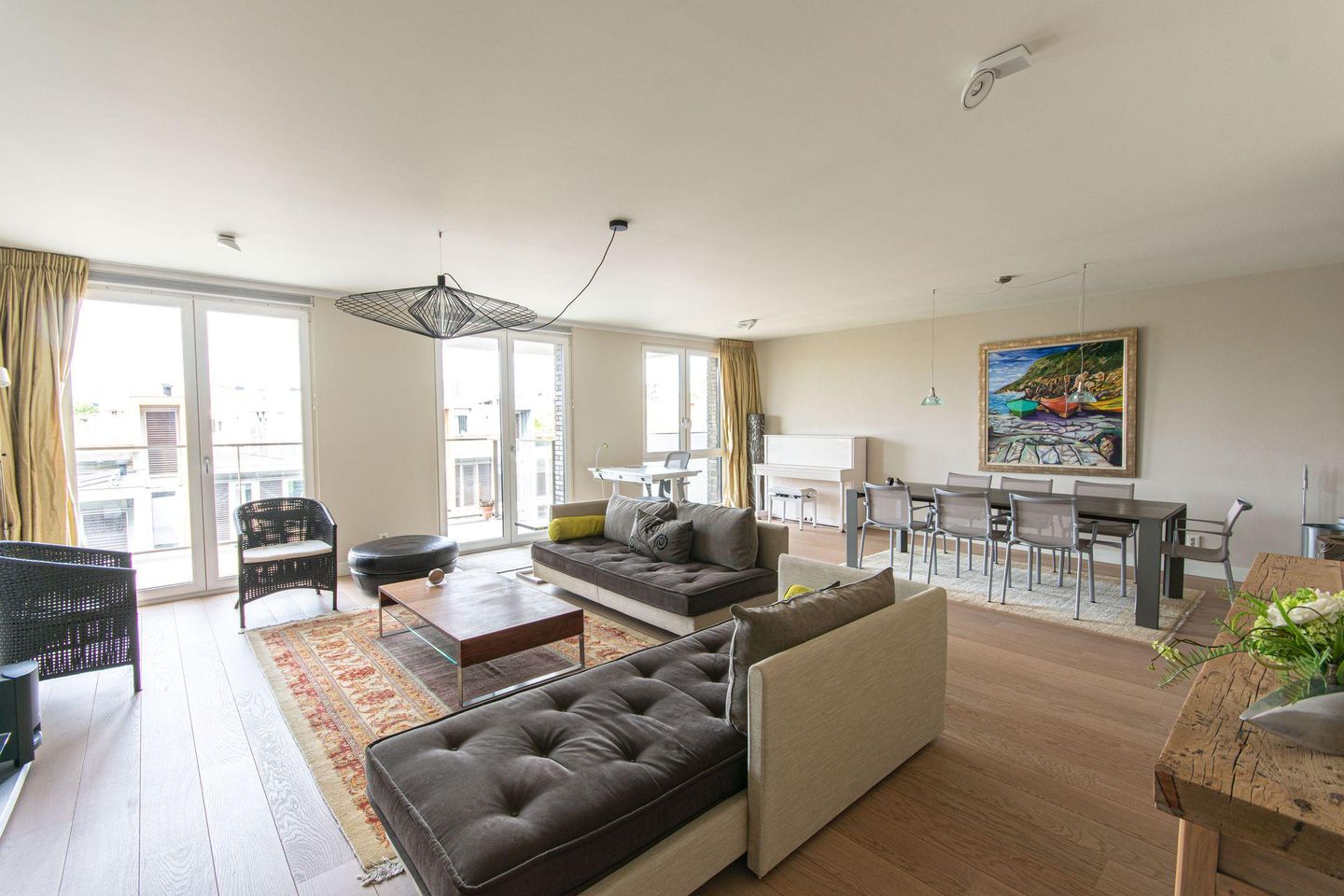 The bright, expansive living room features large windows and opens onto a west-facing balcony. The space includes a dining and study area, as well as a comfortable sitting area. The modern, fully equipped kitchen comes with a dishwasher, large fridge, freezer, and oven.
