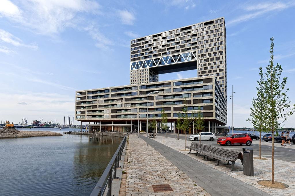 Unique and pioneering in architecture, Pontsteiger is one of the largest and highest residential buildings in Amsterdam. This grand building touches the expanse of the IJ river and rises above the Houthaven. At an altitude of 60 meters, the imposing "bridge section" of eight floors begins, with views stretching all the way to the coast. The impressive dimensions and gleaming appearance of the building make it the city’s newest eye-catcher.