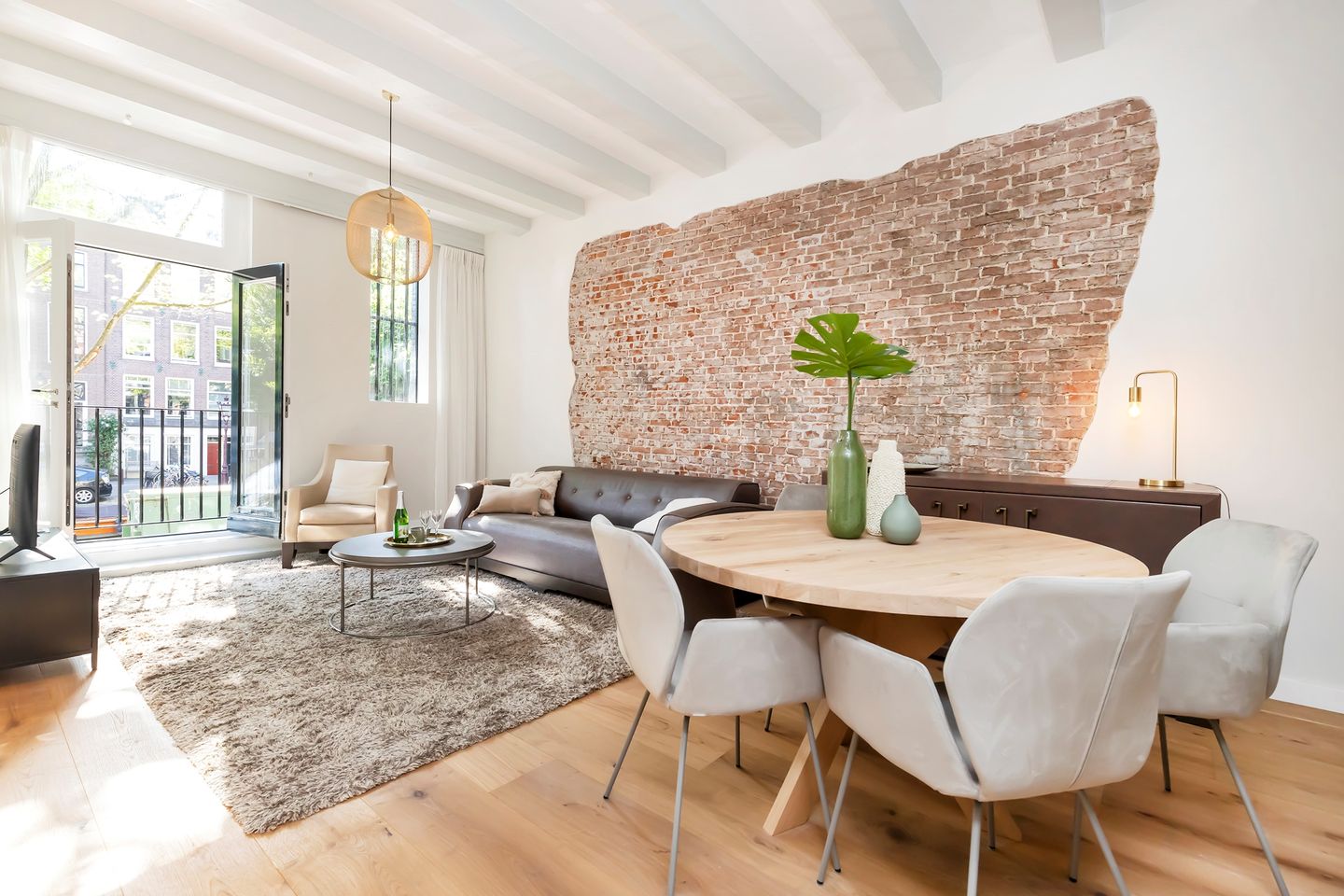The living space is situated at the front of the apartment, with a beautiful view over the canal. The living has enormously high ceilings throughout (….M), together with the partly exposed bricks that bring out the charm of the building built around 1735.