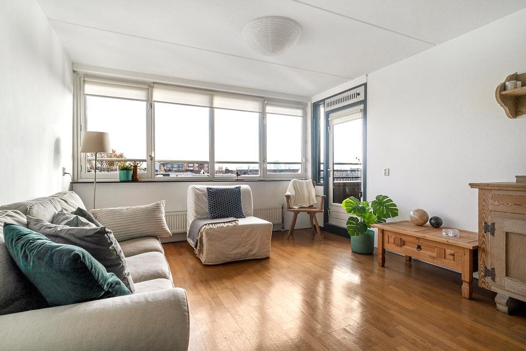 Lovely 2 bedroom apartment on the fifth (top) floor of a well-kept apartment building, accessible with a lift. Due to the beautiful wide windows at the front, the apartment has a great view of the Schinkel and Amsterdam!