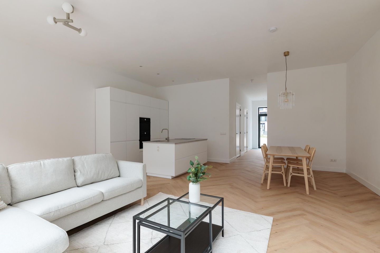 De ruime en lichte woonkamer biedt volop leefruimte en staat in directe verbinding met een strak afgewerkte open keuken, compleet met inbouwapparatuur en eigentijds design. De grote ramen zorgen voor veel lichtinval en een prettige sfeer in huis. De slaapkamer is royaal en rustig gelegen, ideaal voor een goede nachtrust. De badkamer is fris en modern, voorzien van een inloopdouche, wastafelmeubel en toilet. Alles is met zorg ontworpen en uitgevoerd in een neutrale, luxe stijl die helemaal van nu is.