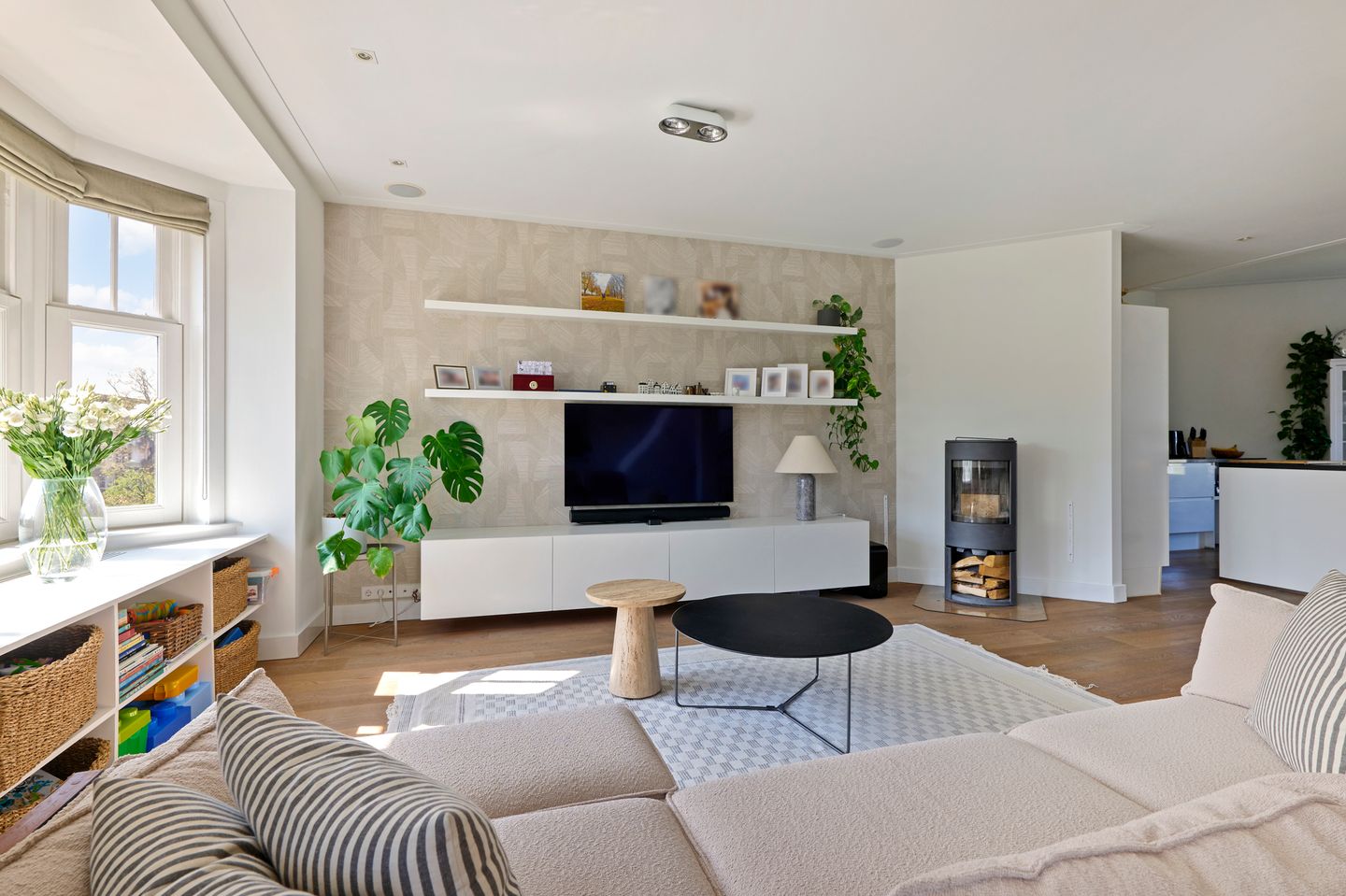 De woning beslaat twee woonlagen, gelegen vanaf de derde etage, en heeft een totaaloppervlakte van ruim 130 m². Alles ademt comfort – van de drie goed bemeten slaapkamers tot de twee moderne badkamers. Wat direct opvalt is de charme van het huis, het interieur is met zorg afgewerkt inclusief een houtkachel in de woonkamer.