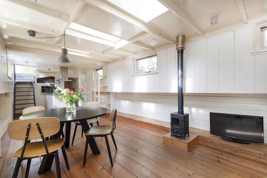 Via the “green” private entrance, you step onto the sunny terrace of the houseboat, which features a built-in wooden bench with fitted cushions. This is the perfect sunny spot to relax and watch the boats pass by. From the terrace, you enter the houseboat into the living room with an open kitchen.
