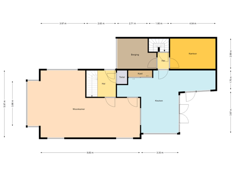 Overdekte entree, hal met de meterkast en het toilet. Ruime woonkamer (ca. 46m2) met erker en veel daglicht. Royale woonkeuken (ca. 26m2) voorzien van een magnetron, keramische kookplaat, oven/grill, vaatwasser, koelkast, vriesladen en openslaande deuren naar de tuin. Daarnaast is de woonkeuken voorzien van een kastenwand en toegang tot de hal. Vanuit de hal bereik je de werkkamer (ca. 11m2) voorzien van een lichtkoepel, berging en de kelder (ca. 13m2).