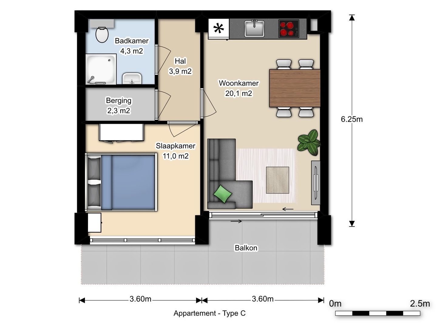 living room with open kitchen equipped with built-in appliances like a stove, extractor, dishwasher, fridge/freezer combination and sink. Throughout the living room and bedroom you have access to the balcony.