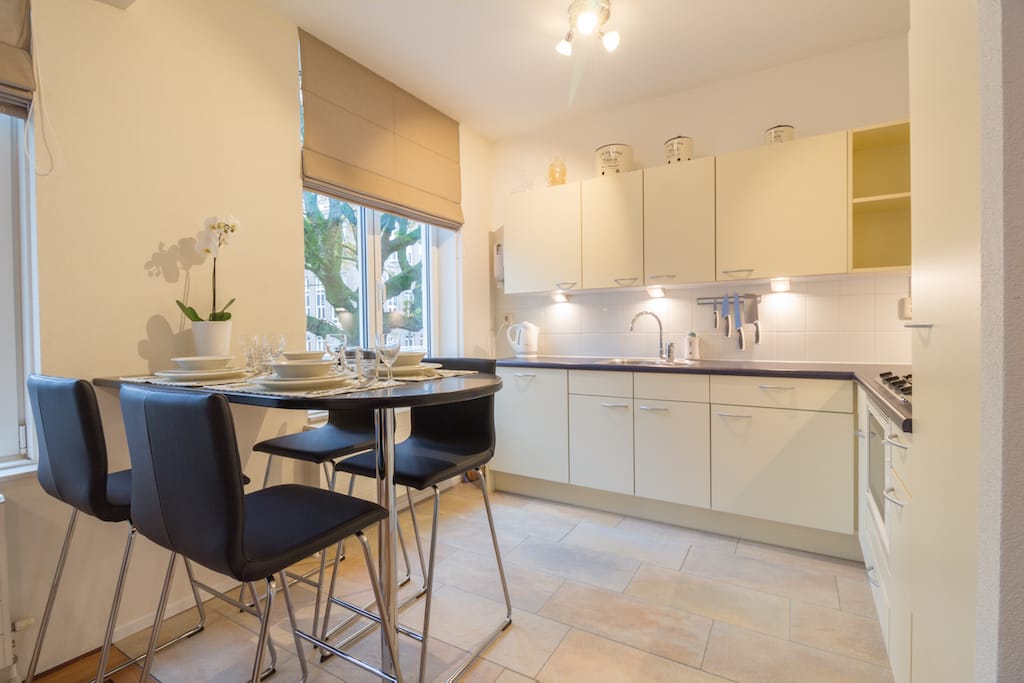 Trap naar beletage en gesloten entree. Ingang woning: hal met garderobe en toilet. Ruime en lichte, charmant ingerichte woonkamer met half open keuken voorzien van inbouwapparatuur zoals vaatwasser, combi magnetron, koelkast, gasfornuis, inline boiler en Qooker en hoge eettafel/bar.