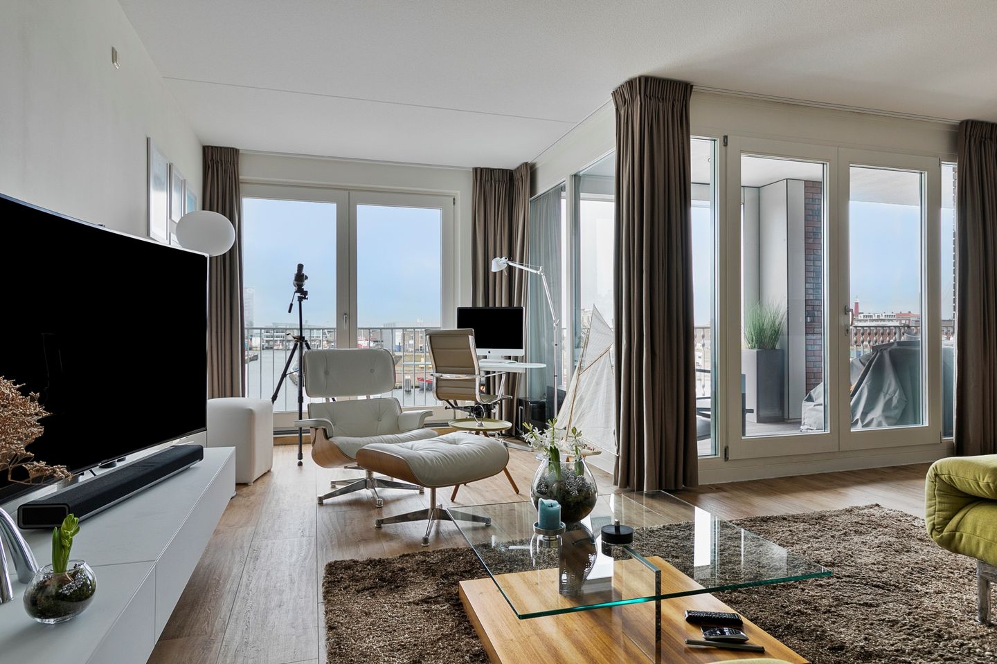 At the far end of the living room, large glass doors lead to a cozy terrace, perfect for enjoying fresh air and outdoor relaxation. From here, you have a beautiful view of the harbour of Scheveningen.