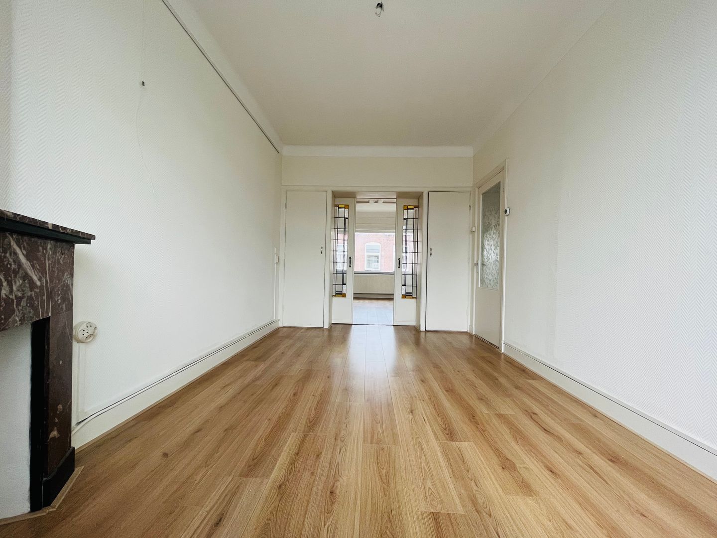 INDELING: Openportiek, u neemt de trap naar de 1e etage waar het appartement zich bevindt. Voordeur, entree appartement in de hal. U neemt de trap naar de 2e etage met entree op overloop. Separaat toilet met fontein. Woonkamer en-suite van in totaal circa. 33 m² welke van elkaar zijn gescheiden middels schuifseparatie voorzien van prachtige glas-in-lood ramen. Vanuit de achterzijde van de woonkamer heeft u middels openslaande deuren toegang tot het heerlijke balkon. Separaat keukenblok welke is voorzien van een kookplaat, koelkast, afzuigkap en magnetron. Twee slaapkamers van circa. 11 m² en 7 m². Badkamer welke is voorzien van een douche en wastafel.