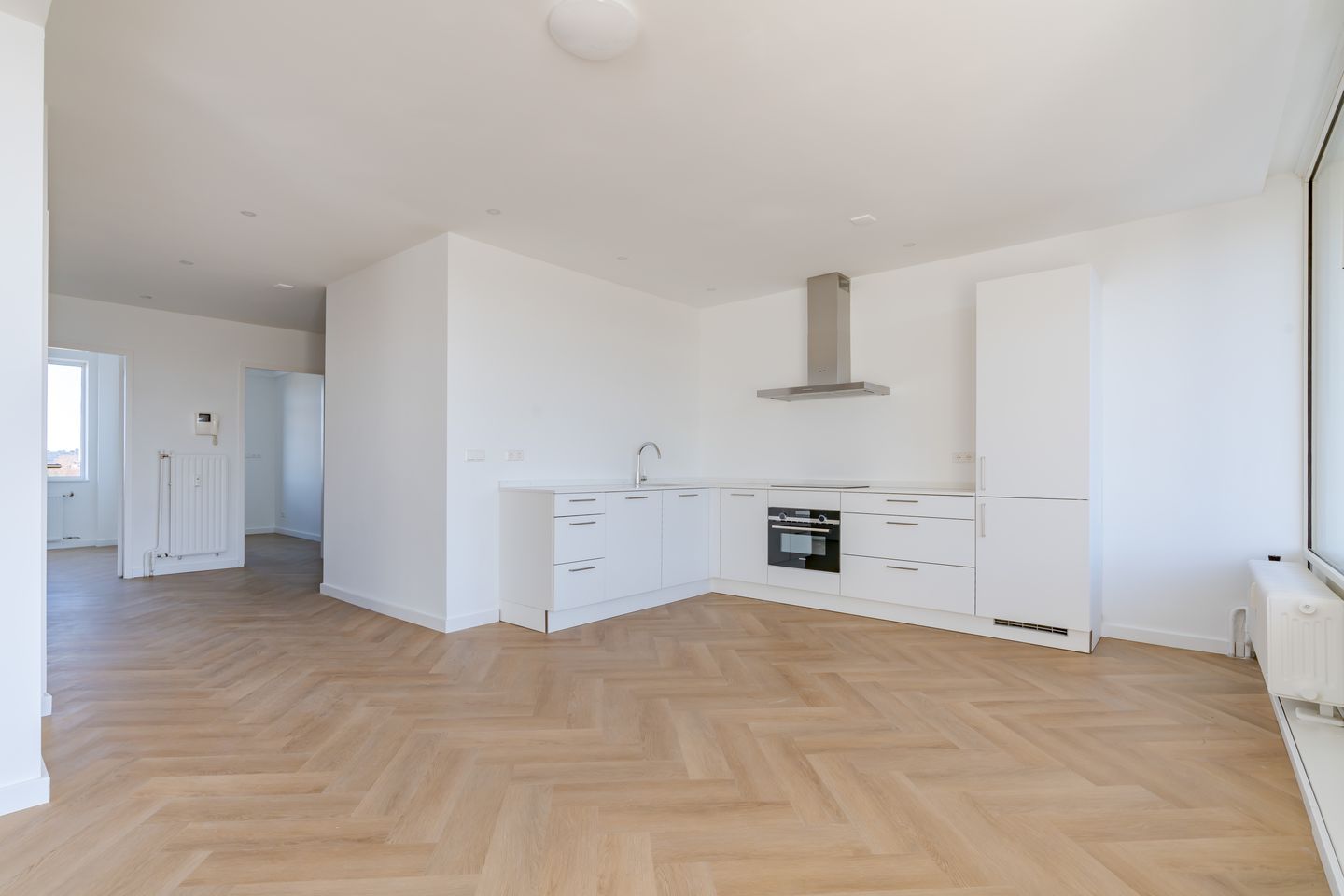 A closed porch with an elevator to the 7th floor, where you can find the entrance to the apartment. A spacious hall with a meter cupboard and a modern separate toilet with a hand basin can be accessed. A very spacious living/dining room with doors to the balcony that is situated on the south, with an unobstructed view. Luxurious open kitchen with all the necessary appliances you need, such as an oven, fridge /freezer, and electric stove with extractor hood. Luxury bathroom with walk-in shower, double sink with drawers, and a design radiator. Three bedrooms, of which one has access to the second smaller balcony with a view over the neighborhood.