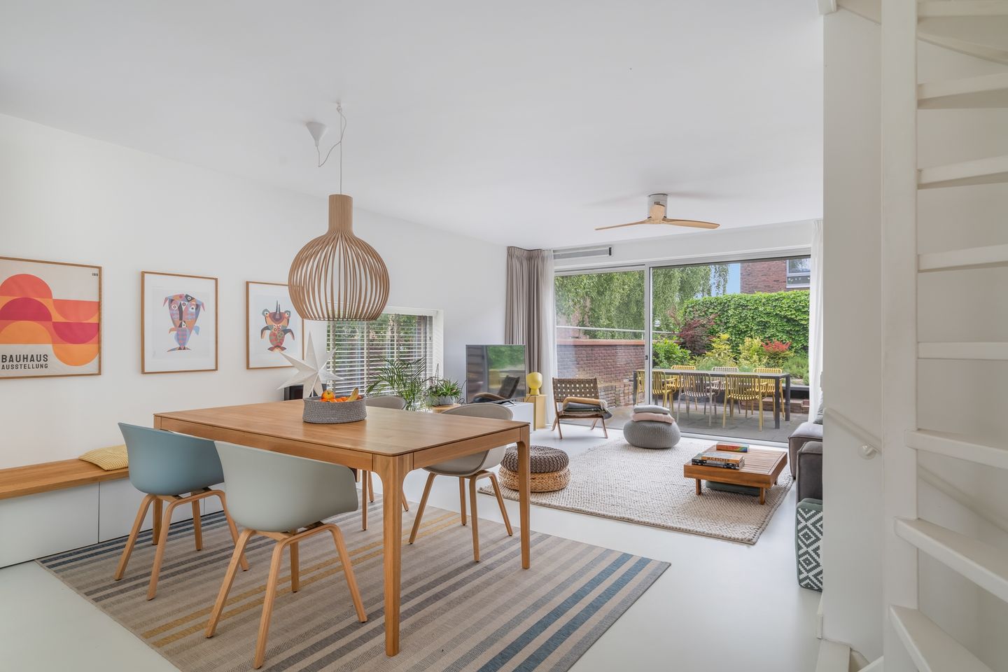From the hallway, a staircase leads up to the first floor. At the top of the stairs, you arrive in the open-plan living room and kitchen area. The kitchen is equipped with a cooking island and all the appliances you need, such as an oven, a dishwasher, an induction hob with extractor, a fridge-freezer, and a Quooker for instant boiling water. The living area is situated at the back and connects directly to a terrace. Large glass doors provide access to this outdoor space, which includes a nice seating area.