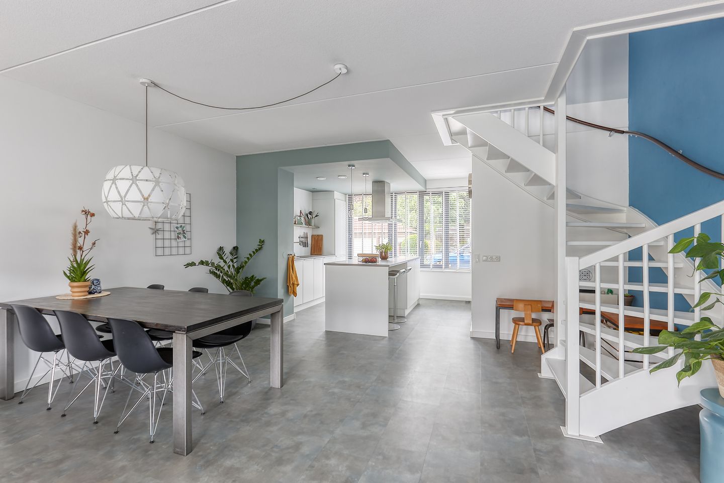 Entree, ruime hal met garderobe en modern toilet. De royale woonkamer is heerlijk licht dankzij de grote raampartij aan de achterzijde en biedt volop leefruimte. Aan de voorzijde bevindt zich de luxe open keuken, uitgerust met een modern kookeiland en hoogwaardige inbouwapparatuur, perfect voor kookliefhebbers. Via openslaande deuren is er toegang tot de fraai aangelegde, zonnige achtertuin met twee terrassen, tuinverlichting, berging en achterom.