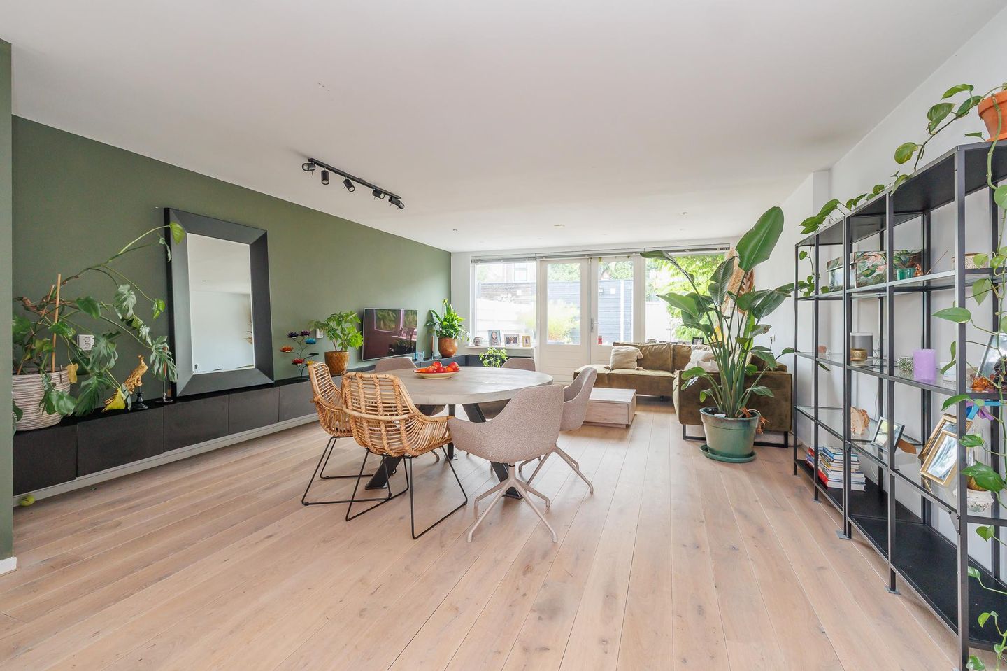 Bij binnenkomst word je direct verwelkomd door een ruime hal die toegang biedt tot het woongedeelte. De woonkamer is licht, strak afgewerkt en voorzien van grote ramen die zorgen voor een aangename, natuurlijke lichtinval. Via de openslaande deuren loop je zo de diepe, zonnige achtertuin in – een heerlijke plek om te ontspannen, te tuinieren of te genieten van een barbecue met familie en vrienden. Dankzij de ligging op het zuiden heb je hier de hele dag zon.