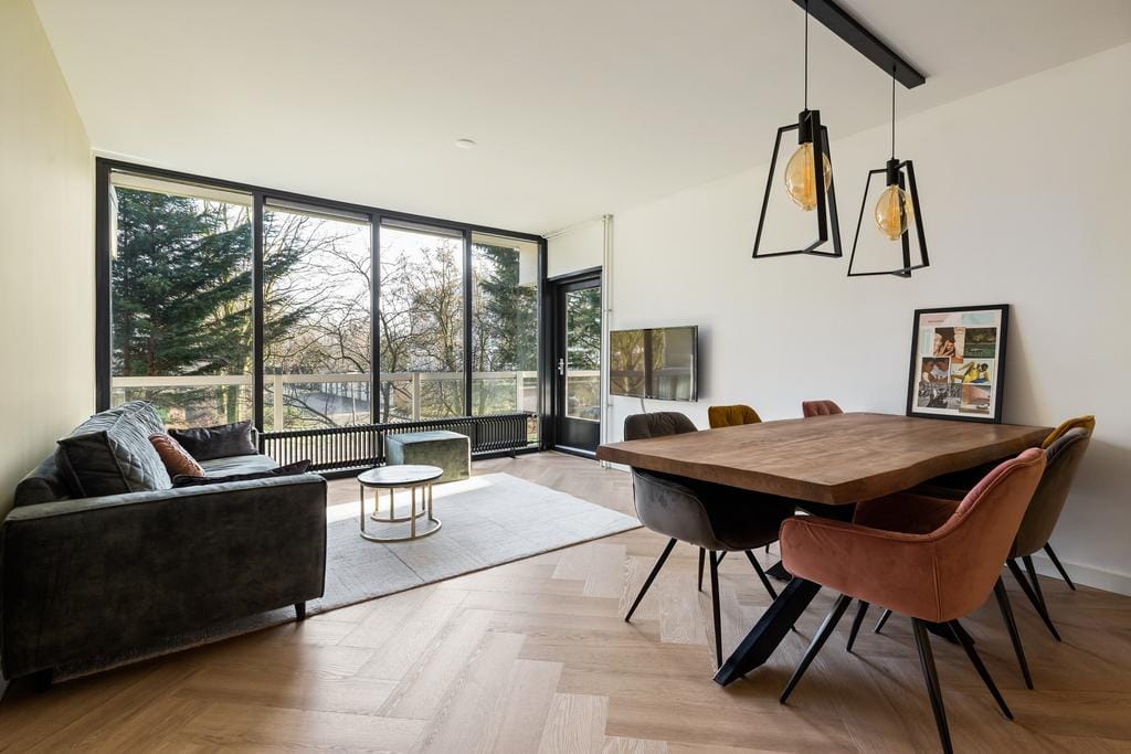 Absolutely everything in this apartment is new; a beautiful herringbone PVC floor, new kitchen with built-in appliances including built-in refrigerator, built-in freezer, steam oven, dishwasher, Quooker, Bora Pure induction hob with integrated extraction, composite worktop and cooking island, induction hob with Bora extraction system, dishwasher, refrigerator, freezer, combi oven and Quooker.