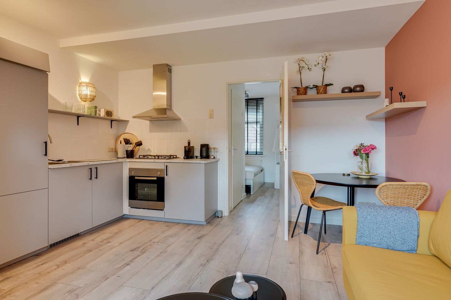 Vanuit de hal hebt u toegang tot de woonkamer en vernieuwde open keuken (2024), Het gehele appartement is voorzien van laminaatvloer (2024).