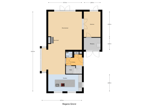 Begane grond: entree; hal met meterkast, een modern toilet met fonteintje, toegang tot de woonkamer, keuken en het kantoor, trapopgang met ruime kast met garderobe eronder; riante living met stalen deuren, openslaande deuren naar de tuin, en een sfeervolle haard; woonkeuken, keuken in wandopstelling met een kookeiland, voorzien van onder andere een inductiekookplaat met geïntrigeerde afzuiging, een stoomoven, een vaatwasser, een grote koelkast, een klimaatkast, een spoelbak en veel opbergruimte; aparte ruimte te gebruiken als kantoor met grote ramen en toegang tot de tuin; berging met toegangsdeur naar de voortuin.