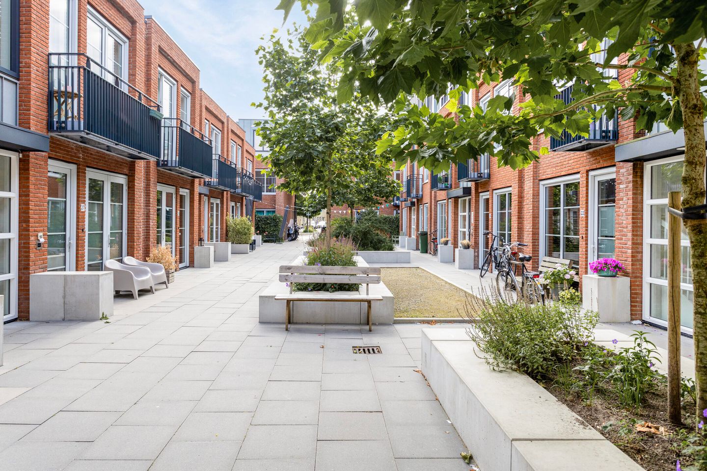 De studio is gelegen op de begane grond en is gesitueerd rondom een collectieve binnentuin met gezamenlijke voorzieningen zoals werkruimten, fietsenberging en gedeelde wasruimte.