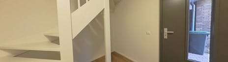 Woonkamer aan de achterzijde met openslaande deuren naar de achtertuin en toegang tot de inpandige berging. Vanuit de woonkamer bereik je de slaapkamer op de begane grond met zicht op de achtertuin en een eigen badkamer.