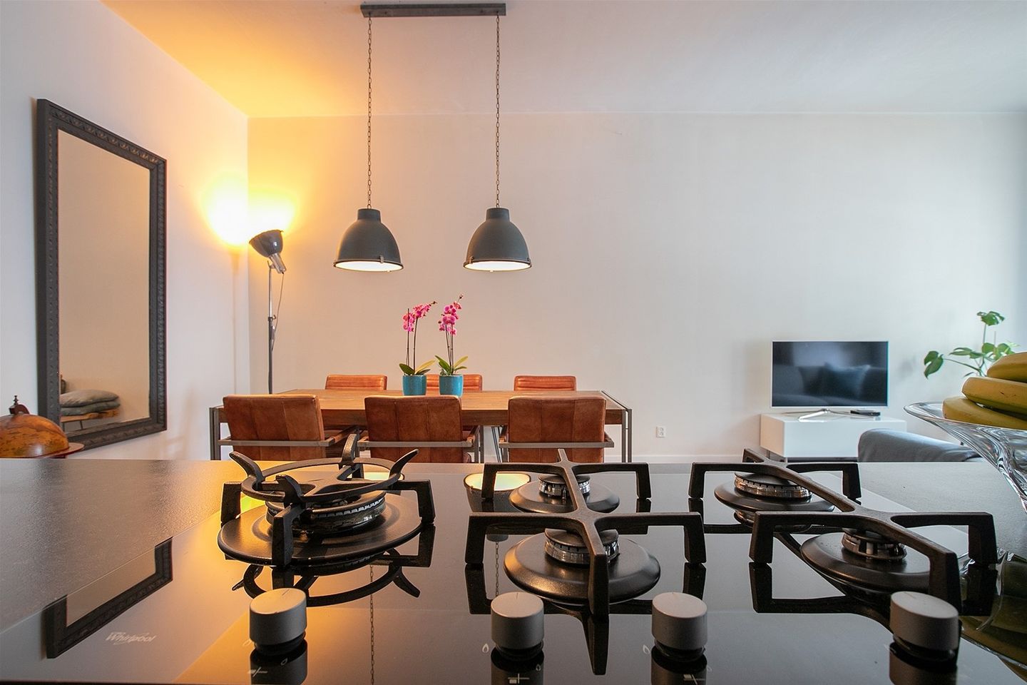 De moderne open keuken (ca. 6,5 m²) is uitgevoerd in hoogglans wit met greeploze kasten en een stijlvol, donker-natuurstenen werkblad. Alles is aanwezig om lekker te koken: