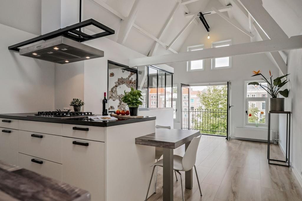 De woning is in 2018/2019 geheel en onder architectuur gerenoveerd. De indeling is sowieso al bijzonder door het feit dat de woning twee panden breed is en met de renovatie is dit verder tot zijn recht gekomen. Zo vind je aan de voorzijde de luxe woonkeuken, met daarnaast de woonkamer. Beiden met een prachtig opengewerkte nok en voorzien van een frans balkon. De woning is op gedetailleerde wijze en met hoogwaardige materialen gerenoveerd. Dit zie je terug in de luxe keuken met diverse apparatuur, de prachtige badkamer, maar bijvoorbeeld ook in de toepassing van het op maat gemaakte staalwerk in de keuken, het toilet en het portaal bij binnenkomst.