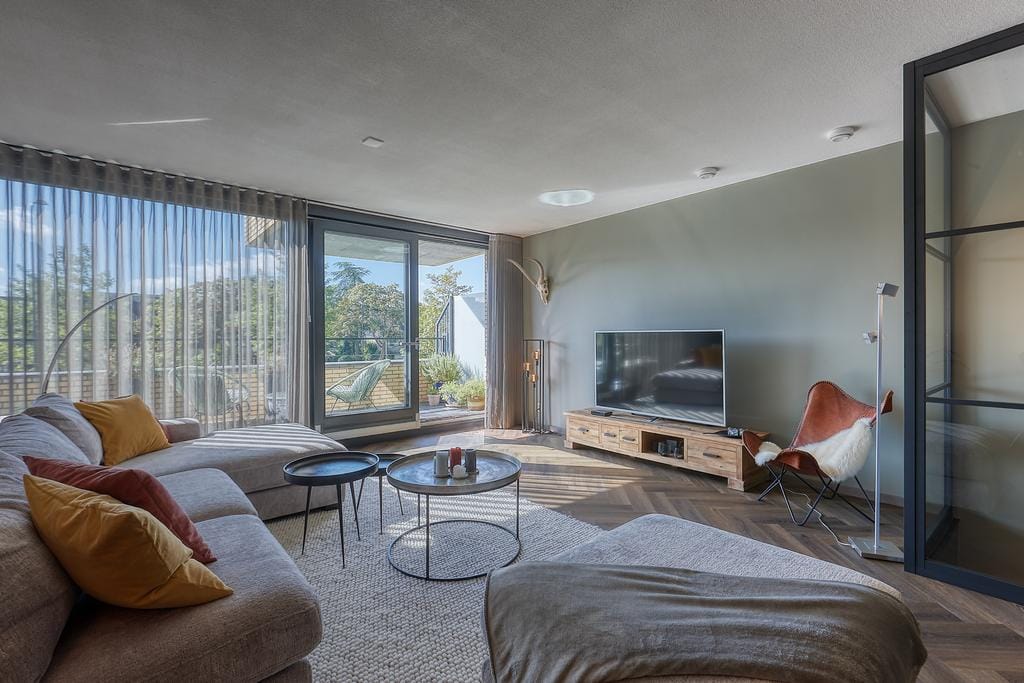 Royale en lichte woonkamer met open keuken. De moderne en luxe keuken is voorzien van alle inbouwapparatuur zoals een inductiekookplaat met afzuigschouw, RVS spoelbak, een Quooker, koel-vriescombinatie en afwasmachine. Door de grote raampartijen aan de voorzijde van het appartement heeft de woonkamer veel natuurlijk licht en een vrij uitzicht. Via de woonkamer is er toegang tot een zonnig balkon (10 m²) gelegen op het zuidoosten.