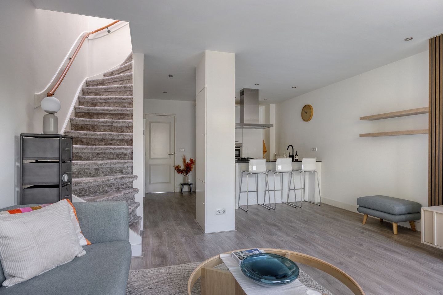 Tweede verdieping: Entree, hal met apart toilet. Aan de voorzijde ligt de lichte woonkamer met grote ramen en een gezellige zithoek. De open keuken met bar is volledig uitgerust met inbouwapparatuur, waaronder een koelkast, vriezer, vaatwasser en combi-oven/magnetron. Aan de achterzijde bevindt zich een ruime slaapkamer, momenteel ingericht als werkkamer. Verder is er een aparte berging met wasmachine en extra bergruimte. Vanuit hier is er toegang tot een klein balkon, ideaal voor de was of om de woning te luchten.