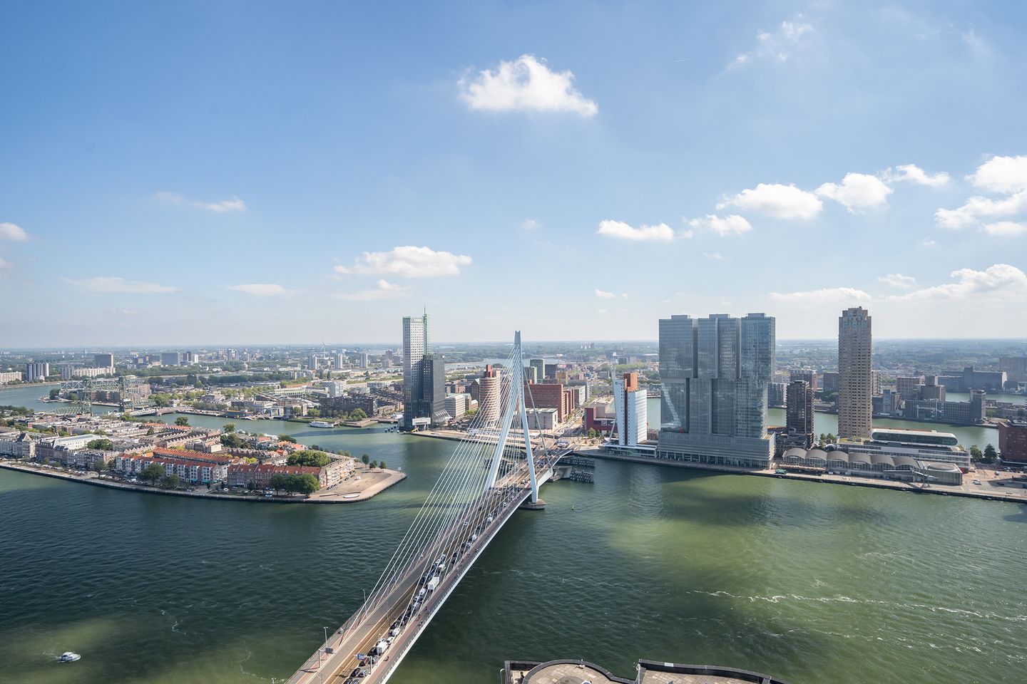 A luxurious and stylish flat in the iconic De Zalmhaven residential tower, with phenomenal views from the 41st floor over Rotterdam; makes all living wishes come true! Thanks to its location, you enjoy breathtaking views over the city and Rotterdam's iconic bridges.